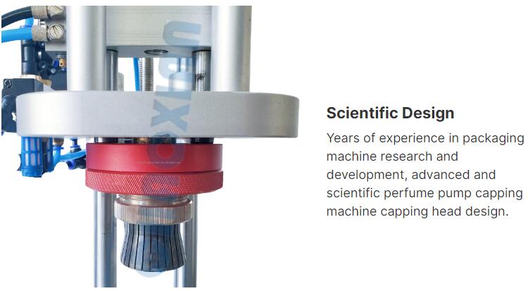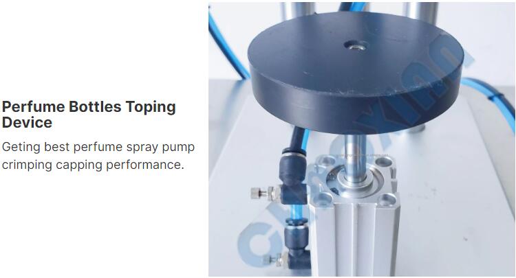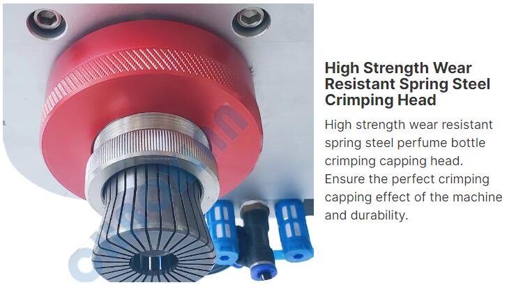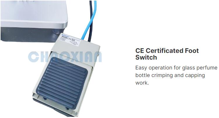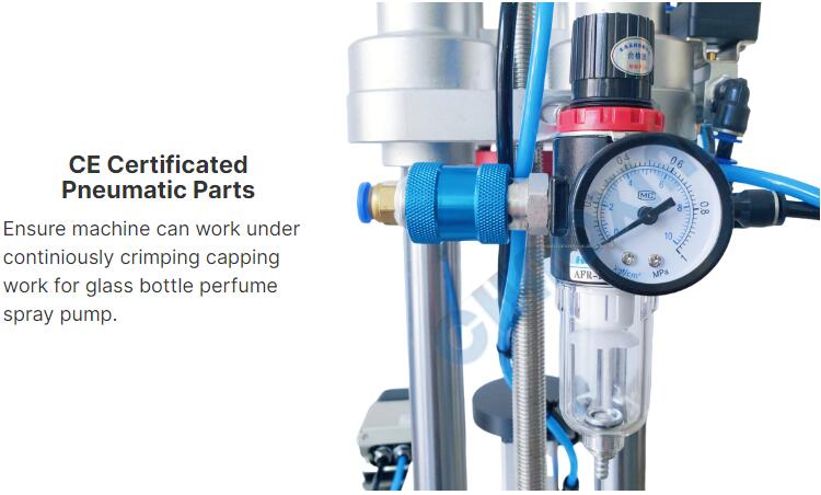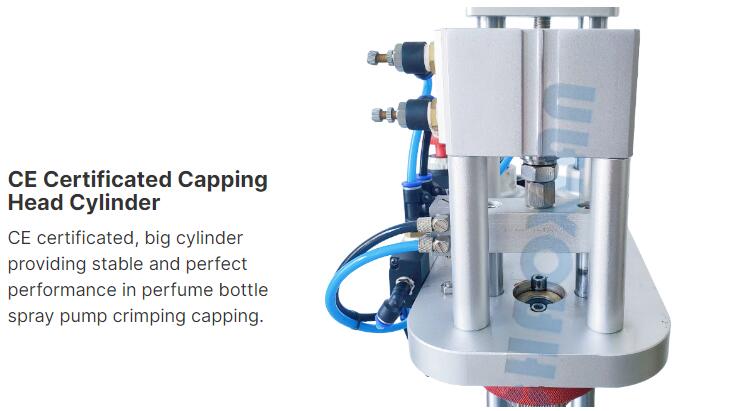 This Semi-Automatic Perfume Spray Crimper Plastic Bottle Cologne Perfume Glass Bottle Pump Capping Machine is fully pneumatic drives model machine, designed for pefume bottles spray pump crimping capping. This Semi-Automatic Perfume Spray Crimper Plastic Bottle Cologne Perfume Glass Bottle Pump Capping Machine is widely used in perfume industries.