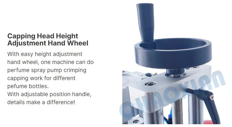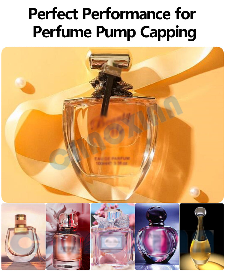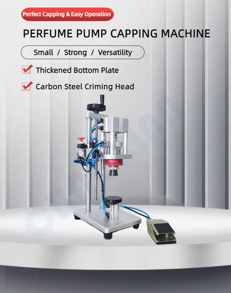 Semi-Automatic Perfume Spray Crimper Plastic Bottle Cologne Perfume Glass Bottle Pump Capping Machine is used to perfume bottles, metal spray pump crimping capping.